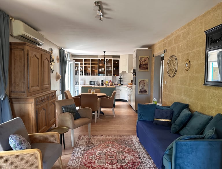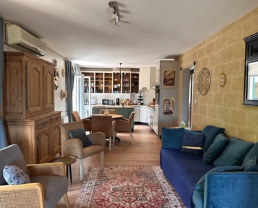 Salon spacieux avec canapé confortable et décoration chaleureuse.Climatisation, Fibre WIFI, lave-linge.... Deux studios attenants avec salle de bain et de douche...